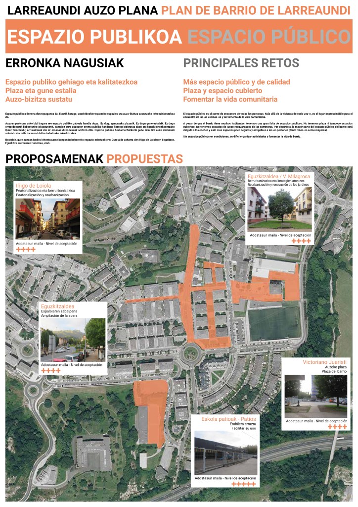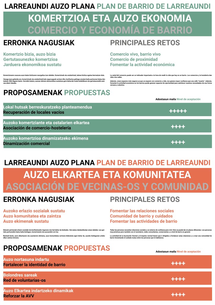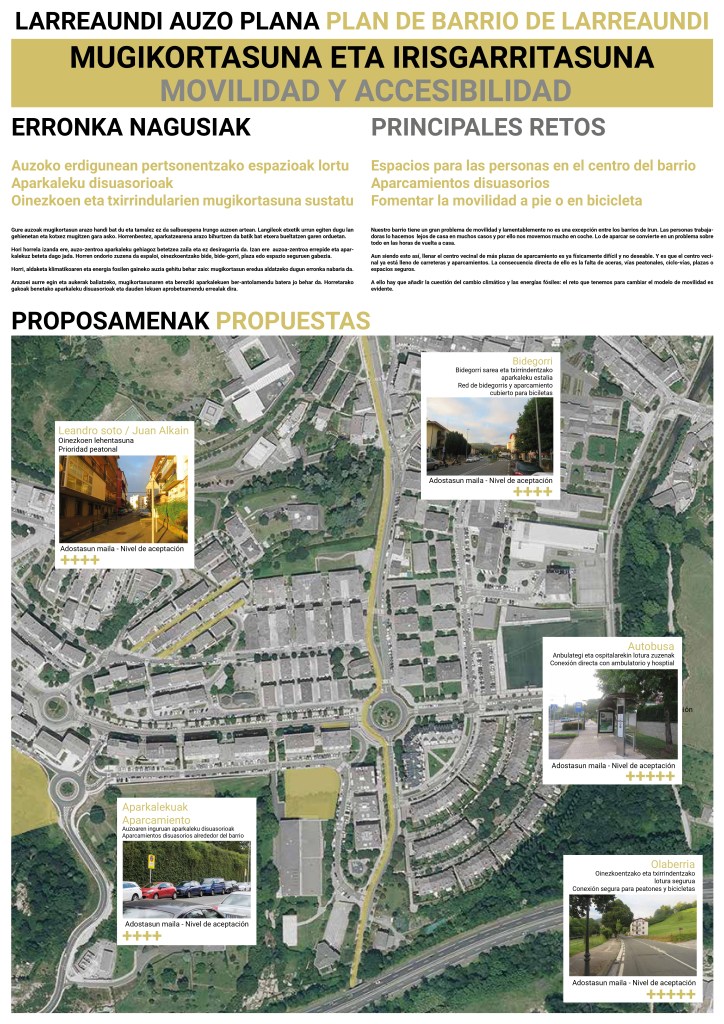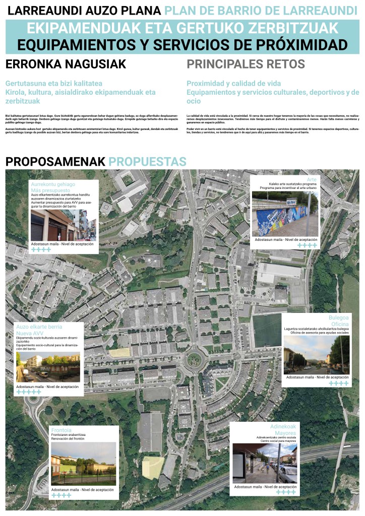 Durante el curso 2022-2023 hemos desarrollado el plan de barrio de Larreaundi. En él, podemos encontrar propuestas para el barrio en ámbitos que van desde los equipamiendo a la movilidad pasando por el medio ambiente o la transición engergética.